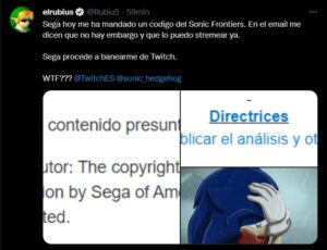 El reconocido streamer español Rubius ha sido baneado de la plataforma por transmitir contenido con derechos de autor según capturas que adjunto en su propia cuenta de Twitter. El motivo de su baneo fue por estar jugando al nuevo videojuego Sonic Frontiers. En sus historias de Instagram ha dicho lo siguiente: